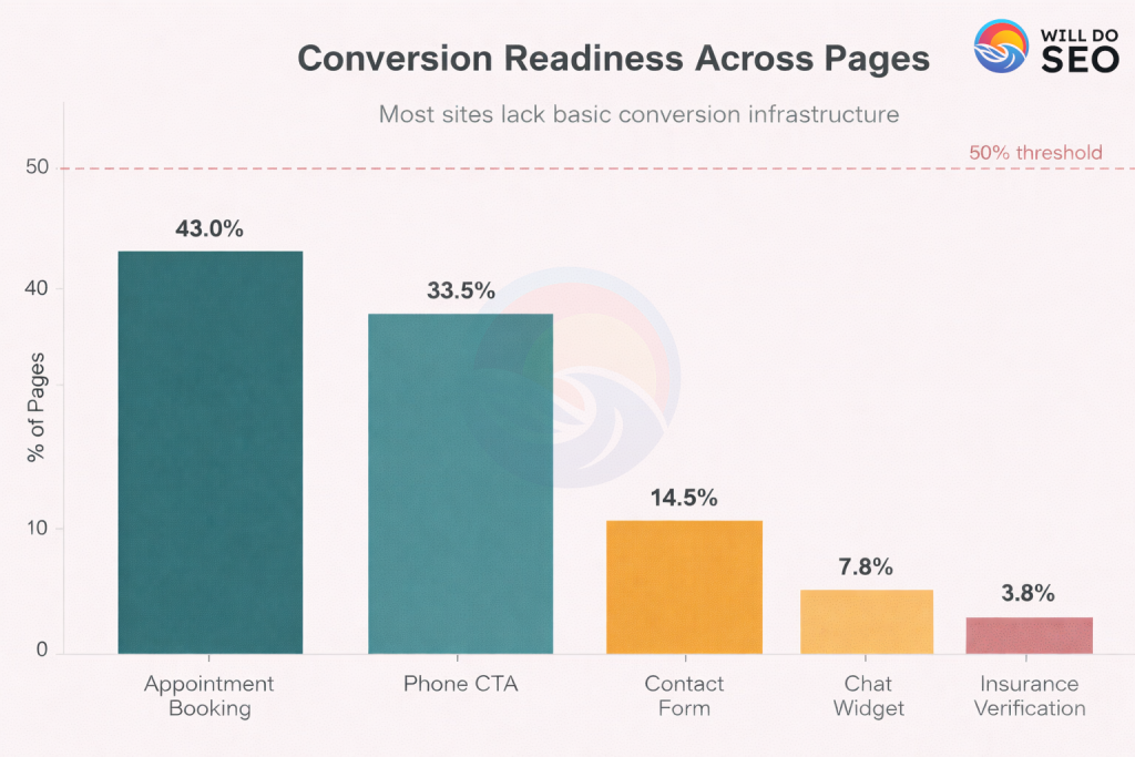Conversion outcomes unknown: I can measure conversion element presence but cannot measure actual patient conversion. Presence of a chat widget doesn’t guarantee effectiveness.