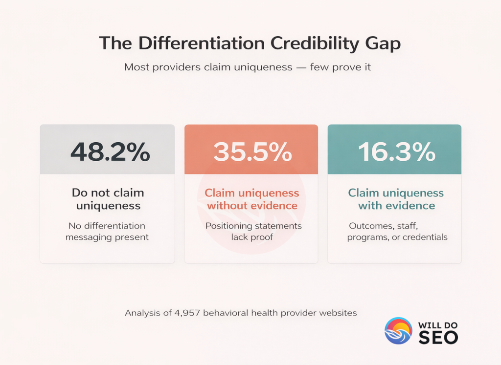 Pages were categorized as: (1) making vague claims with no substance, (2) making claims with supporting evidence, or (3) no differentiation claims. This reveals the gap between providers claiming uniqueness versus demonstrating it.