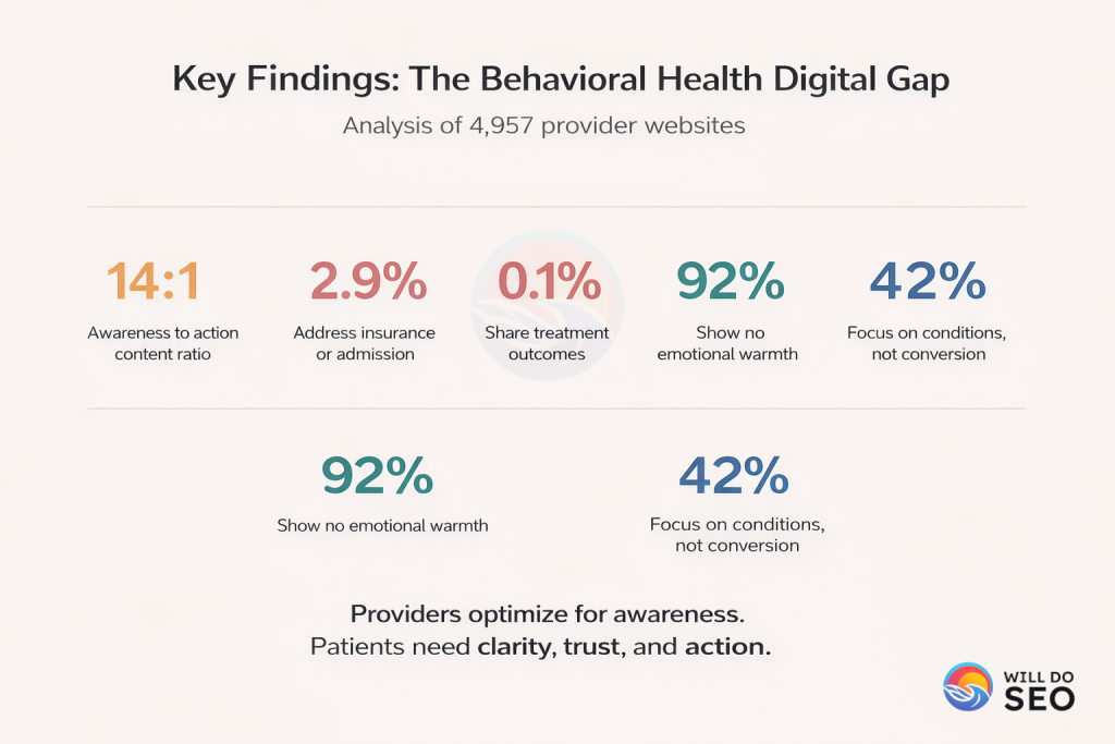 Across 4,957 behavioral health provider websites, representing approximately 63.1% of the private provider market, the analysis reveals consistent gaps in patient accessibility: