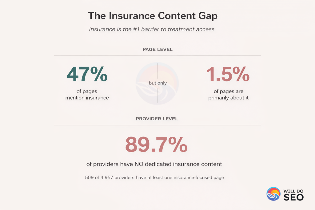 - 89.7% don’t have insurance content. Adding it is instant differentiation, and great for search visibility, especially with a local / GEO focus.