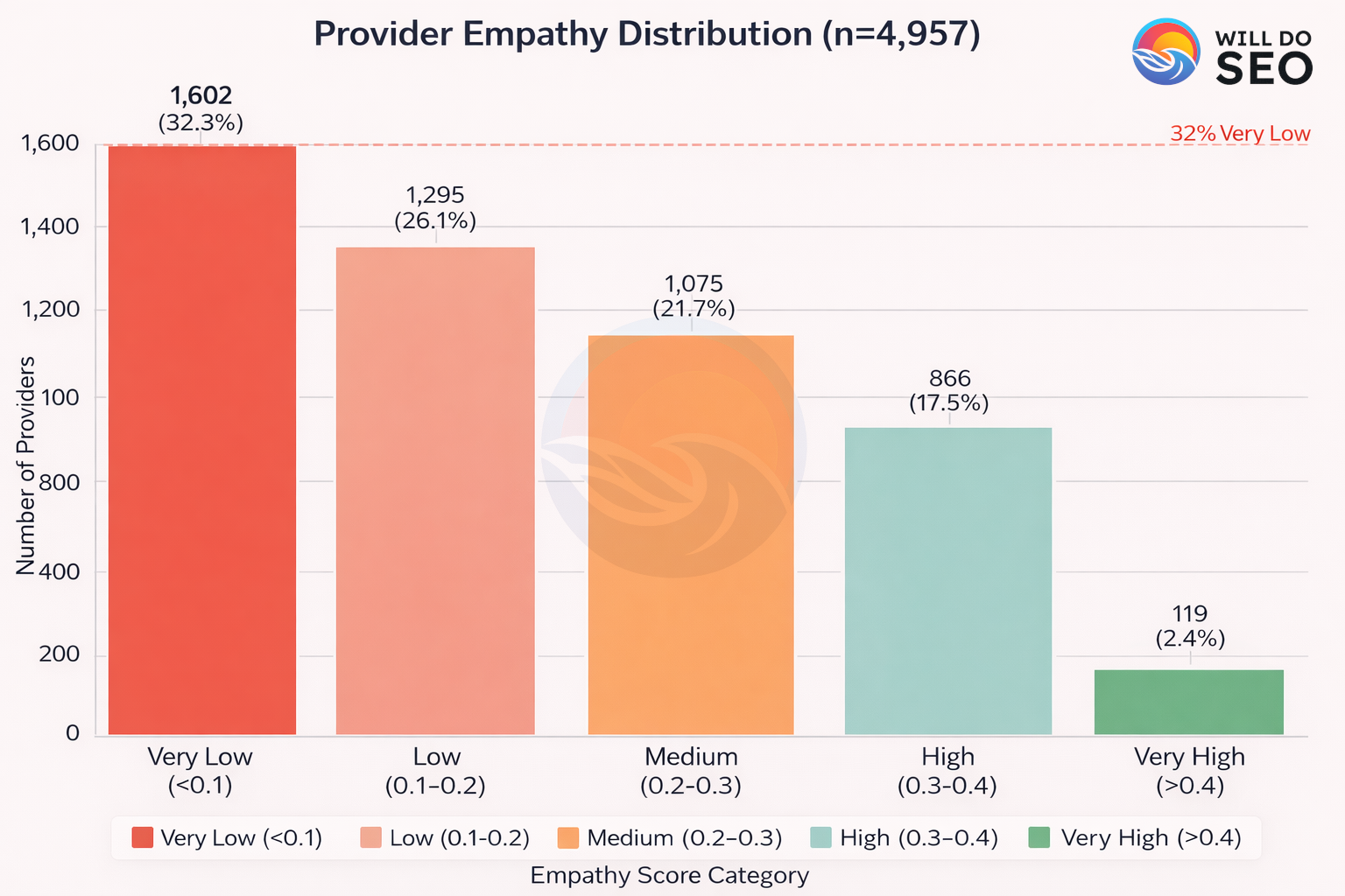 At the provider level, the distribution is equally concerning. Among nearly 5,000 providers analyzed, 32.3% scored “very low” on empathy (below 0.1 on the scale), while only 2.4% achieved “very high” scores (above 0.4). The median provider sits firmly in clinical territory.