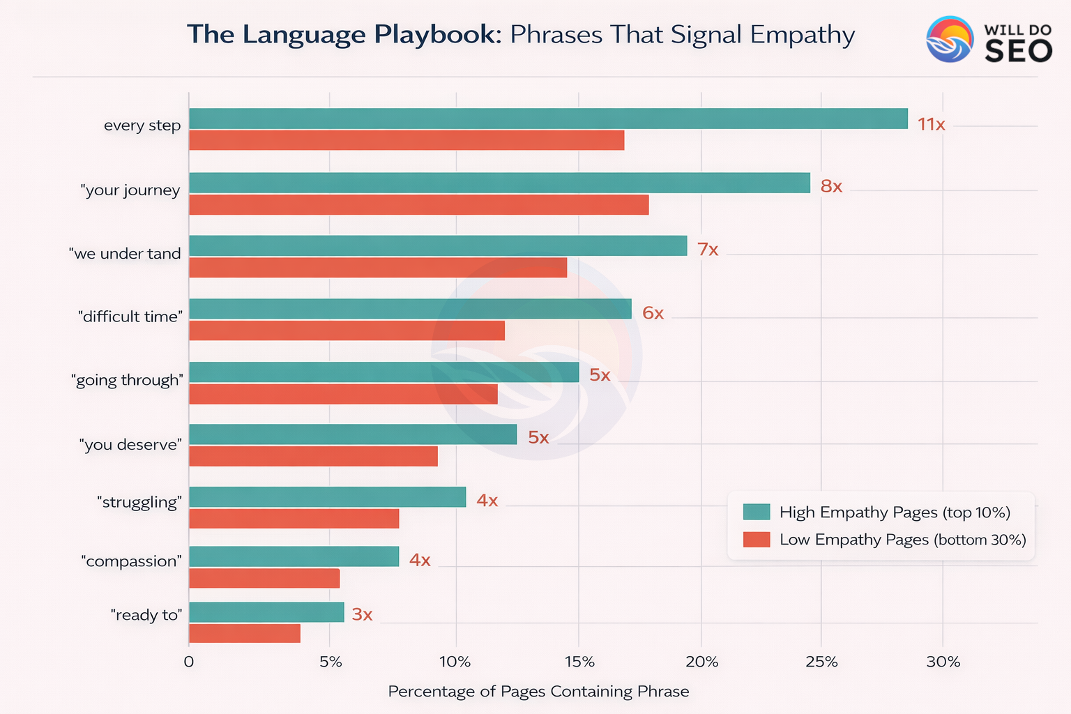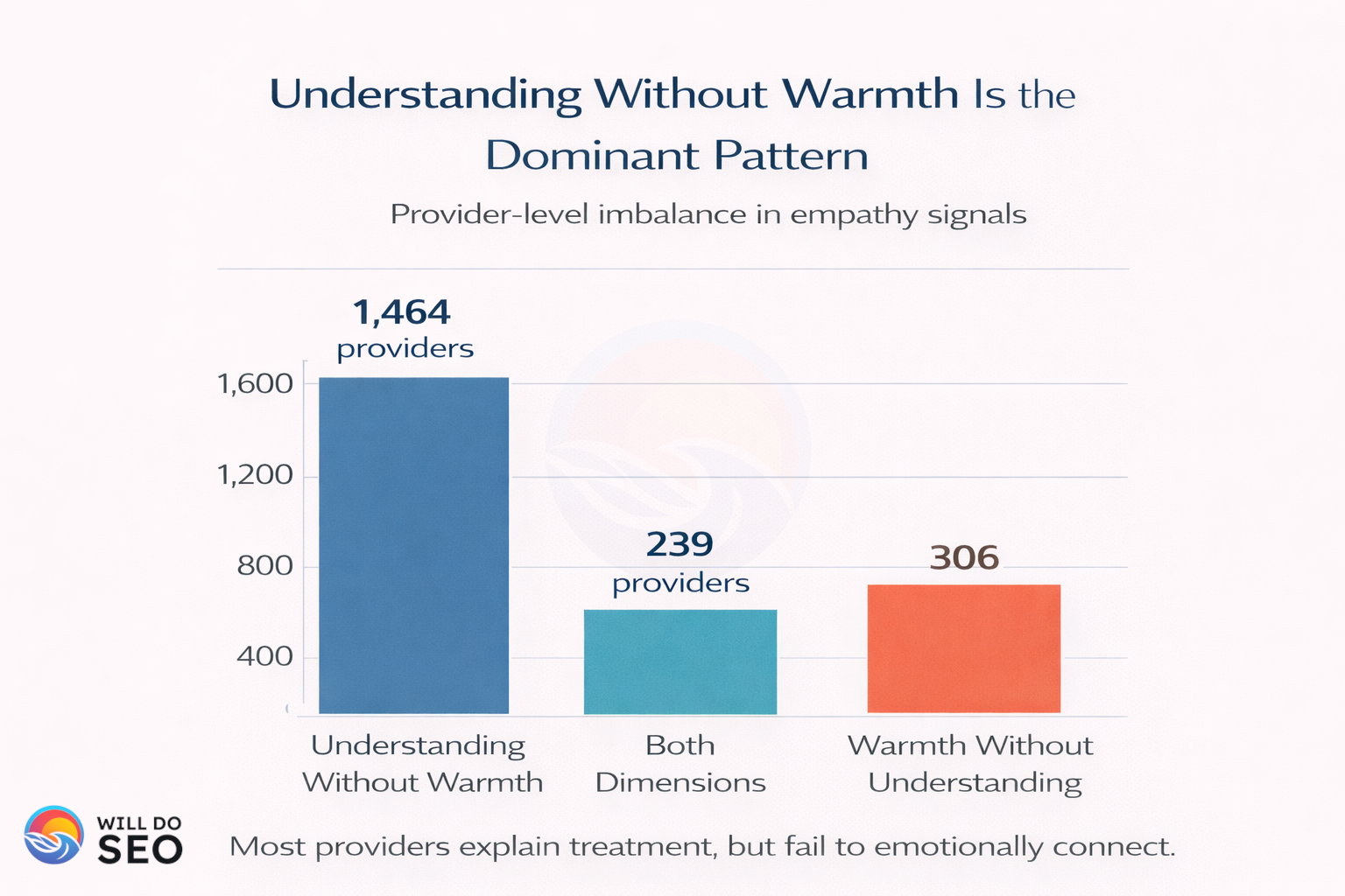 Consider the gap: If you’re competing for visibility and conversions in a space where 70% of providers have zero empathy signals, simply adding warmth, understanding, and engagement to your content puts you in rare territory. You become one of the 2.4% scoring “very high” on empathy, not through massive investment, but through intentional language.