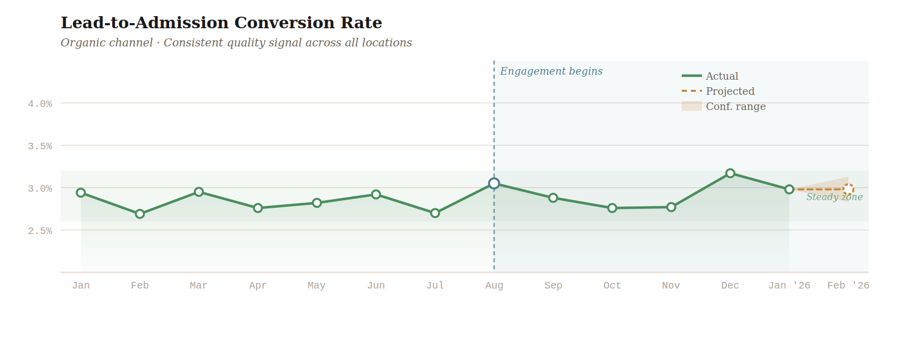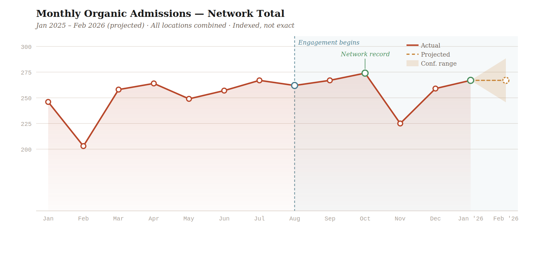 Organic admissions have remained stable throughout 2025 and into 2026 across an expanding network. Multiple single-month records have been set since the engagement began.