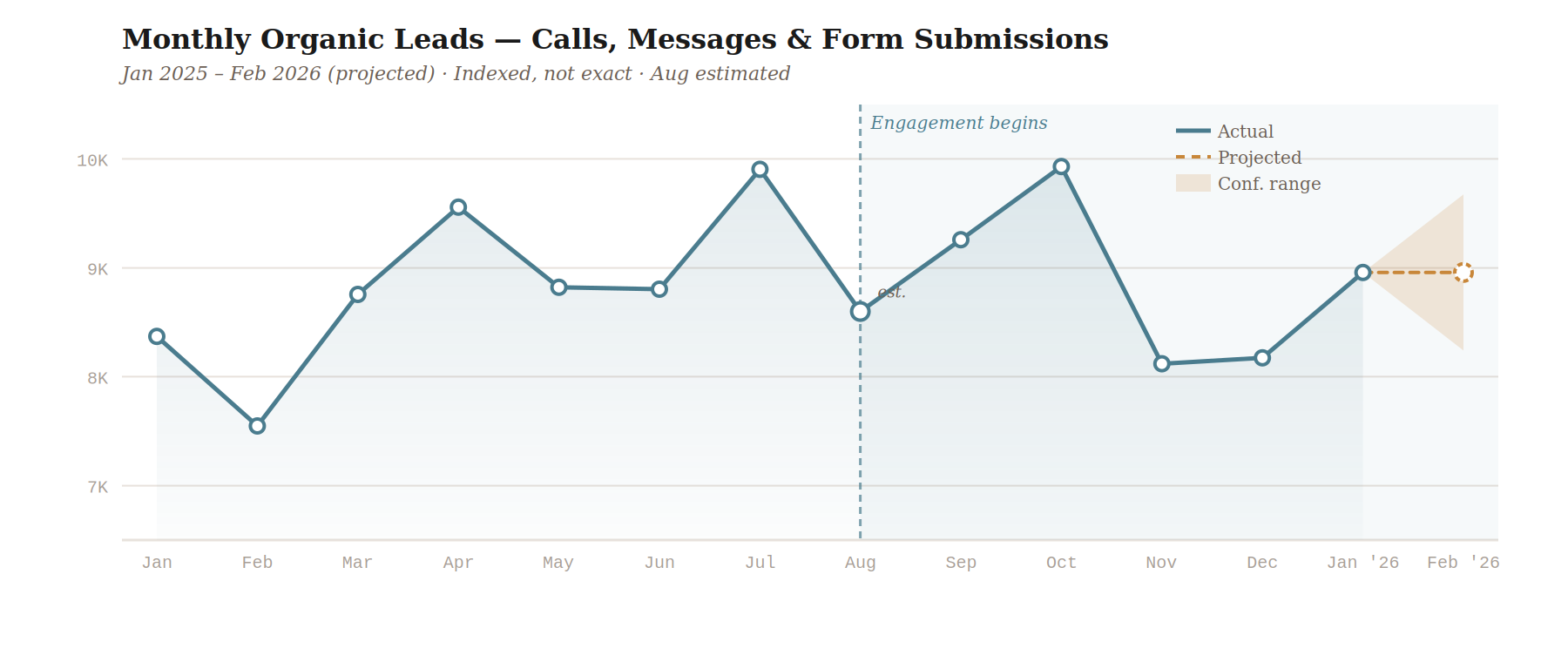 Organic calls, messages, and form submissions have averaged approximately 8,600 per month across the network since the engagement began. Volume has remained consistent across all locations, setting new network highs.