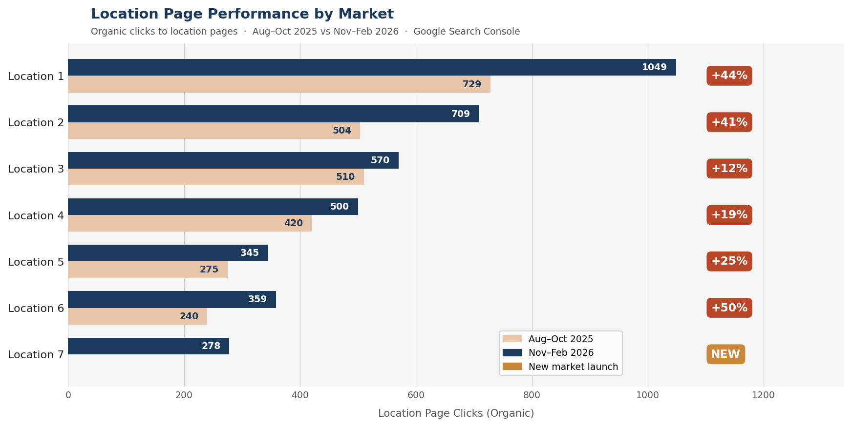 The results are visible in the location page data. Across seven active markets, location pages have consistently attracted high-intent organic clicks throughout the engagement period, with click-through rates running between 10% and 20%. That range indicates organic search has been surfacing the right pages to the right searchers, not generating incidental traffic.
