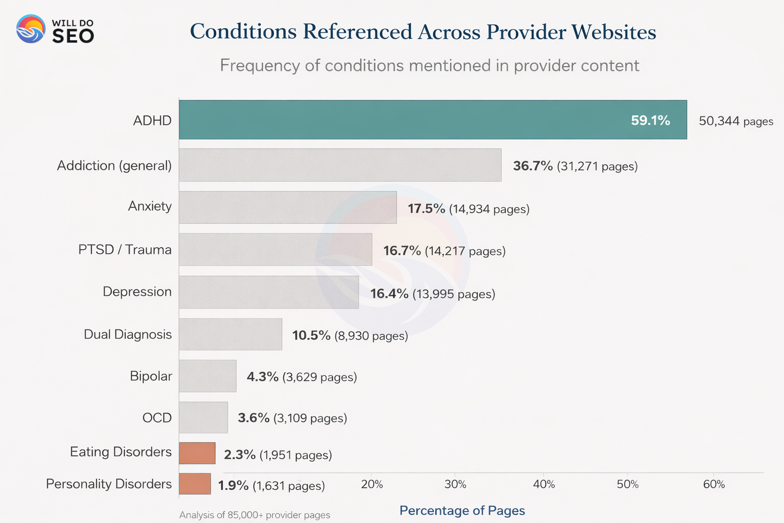 ADHD appears on 59.1% of pages, nearly twice the coverage of general addiction content. 91% of providers create ADHD content, making it the most universally covered condition in behavioral health.