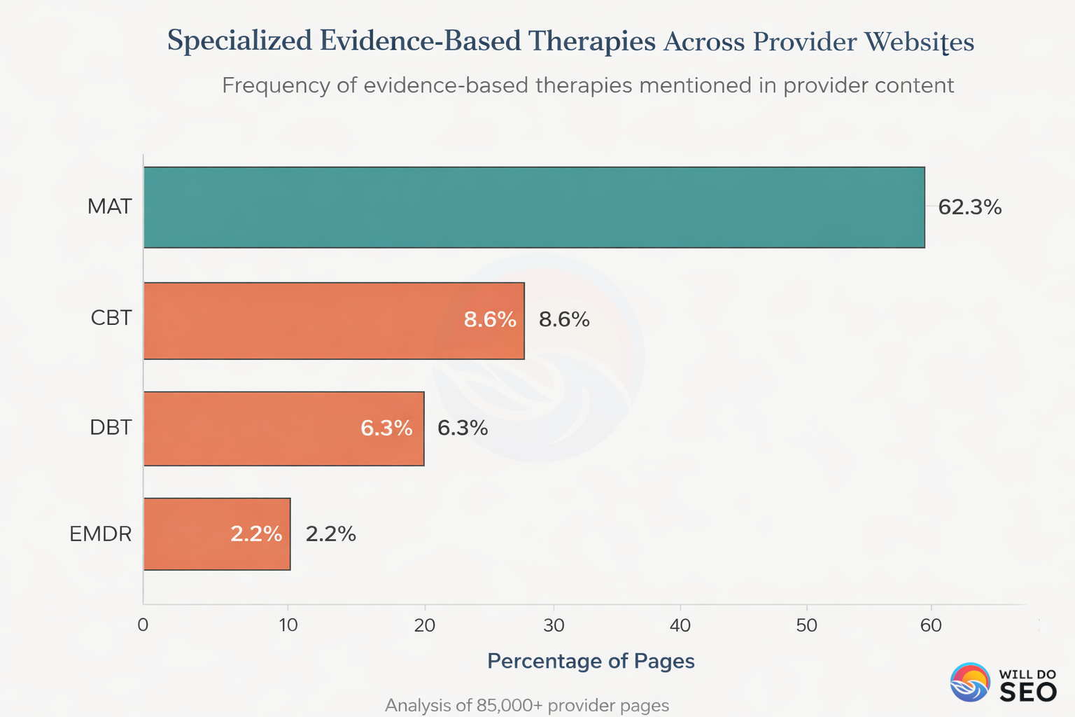 MAT dominates at 62%. Evidence-based psychotherapies like EMDR (2.2%) and DBT (6.3%) are far behind.