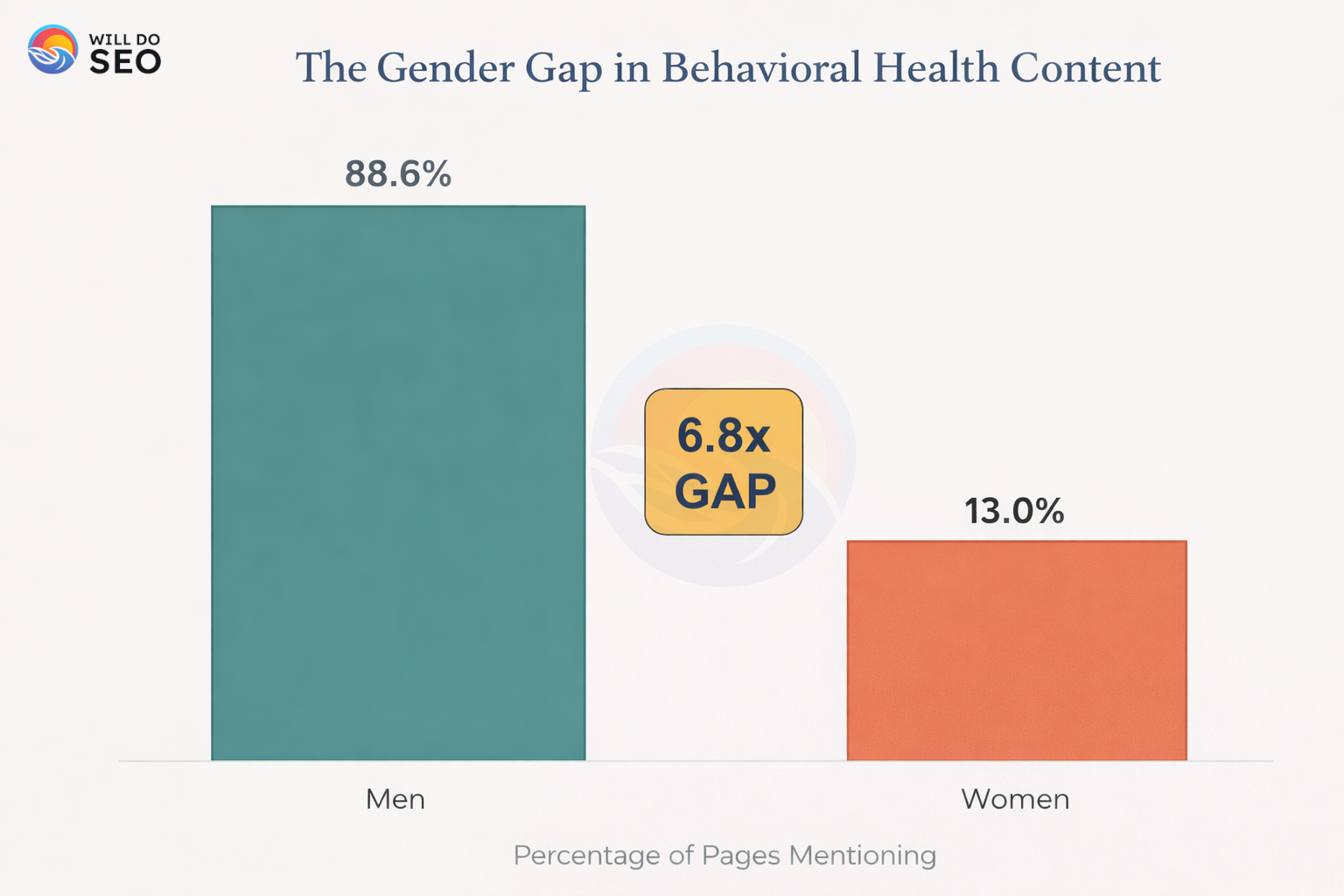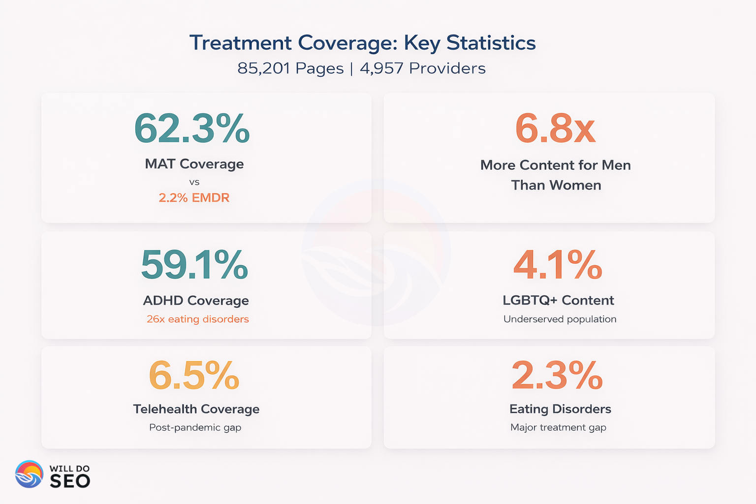 Men get nearly 7x more content than women. 59% of pages mention ADHD, but only 2.3% mention eating disorders. Despite post-pandemic growth, only 6.5% of content addresses telehealth.