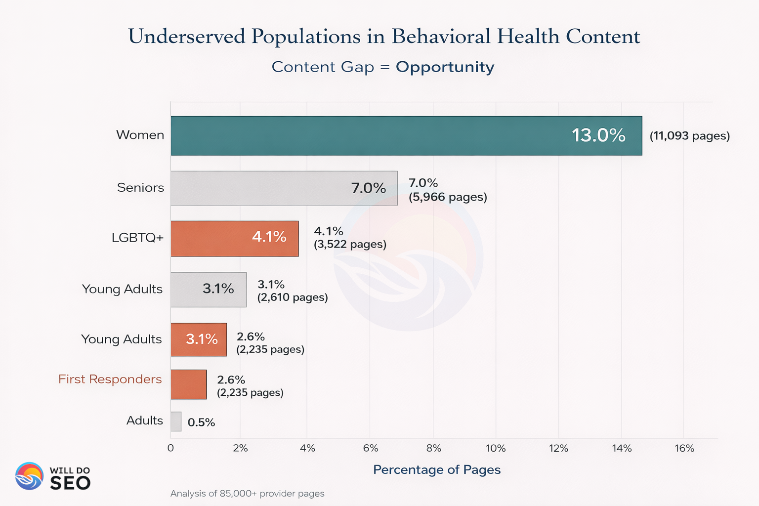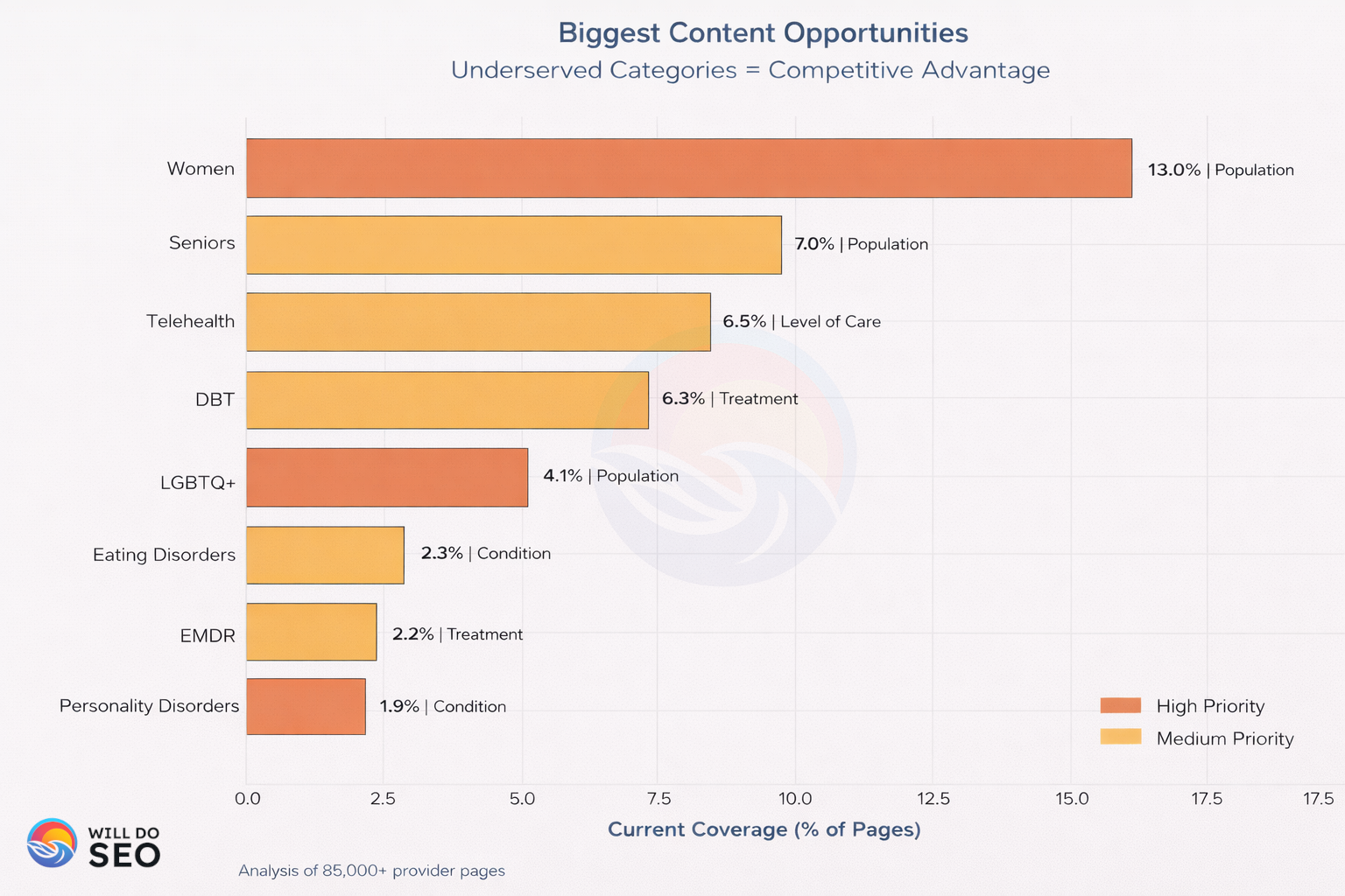 These gaps aren’t just competitive opportunities. They’re equity concerns. Women getting 1/7th the content despite unique treatment needs. LGBTQ+ populations underserved despite higher risk. Seniors ignored despite a growing crisis. Eating disorders invisible despite the highest mortality rate.