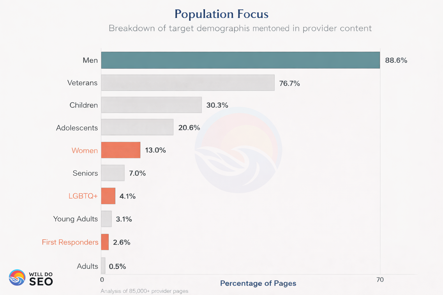 Scenario 3: You serve multiple populations but your content doesn’t reflect it. Action: Create population-specific landing pages. You treat veterans, women, and young adults, but only have veteran content. Result: Capture search traffic from populations you already serve.